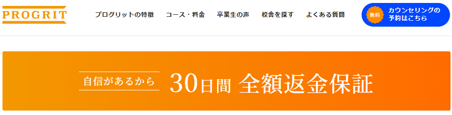 プログリットのいいところは、コンサルタントとのやりとりやカリキュラムの内容もあるのですが、それと同様に「30日間全額返金保証」というサポートがあることです。