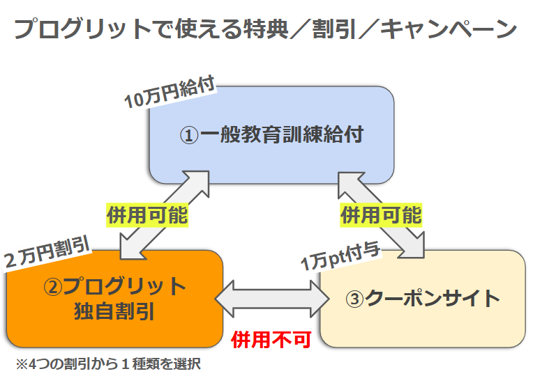 ※注意:給付金と独自開催の割引キャンペーンは併用可能です。独自開催のキャンペーンは4種類あるのですが、いずれか一つだけ利用できます。プログリット独自特典とクーポンサイトは併用できます。
