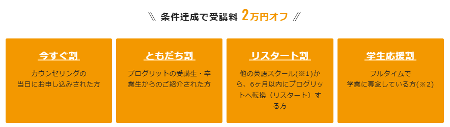 他の英語スクールからプログリットに乗り換える場合、受講料が2万円割引されます。他のスクールに満足できなかった方には、この制度がおすすめです。