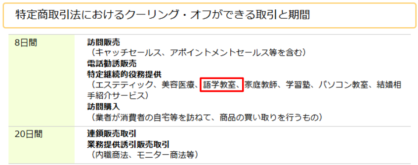 クーリングオフの対象サービスに語学教室が含まれています。このためプログリットもクーリングオフが利用できます。