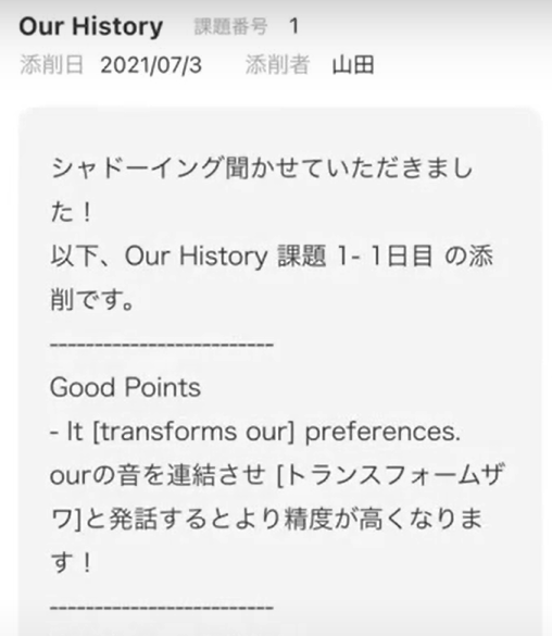 先生いわく「シャドーイングの添削はものすごく大変」と言ってました。