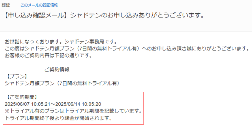 シャドテンの7日間無料体験を利用すると、体験期間が終了する日時に自動的に本契約となります。