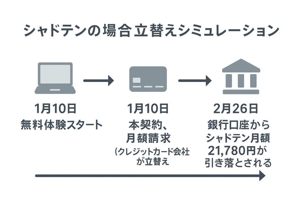 実は、ここに大きな誤解があります。クレジットカード払いの場合、シャドテンへの支払いと実際の口座引き落としには1〜2ヶ月のタイムラグがあるんです。