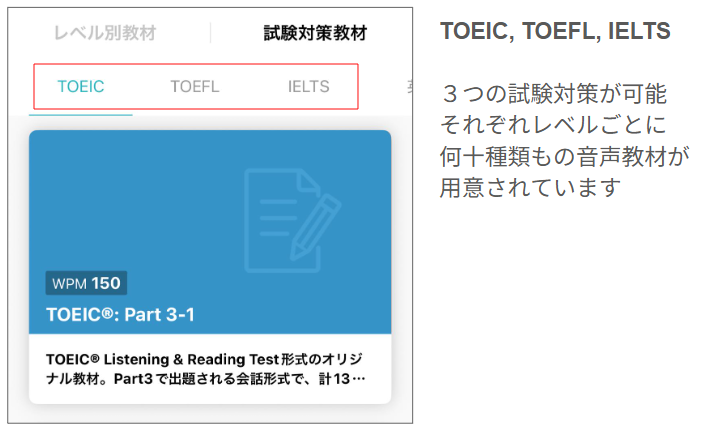 ✅ 初心者から上級者まで、4段階のレベル別教材があり、TOEIC, IELTS, TOEFLの教材も充実