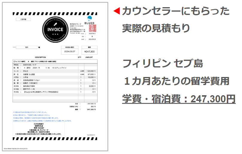 先に結論から言うと、語学学校と学校寮の費用は247,300円でした。ここに航空チケットや保険、現地の生活費など含めたフィリピン留学の総額は447,300円でした。